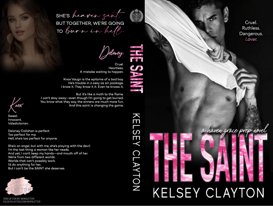 | 🔥🔥 COVER REVEAL 🔥🔥 Check out the GORGEOUS cover for The Saint by Kelsey Clayton! The Saint is book 2 in the Haven Grace Prep series. Knox Vaughn is the epitome of a bad boy. #ComingApril23rd DELANEY Cruel. Heartless. A mistake waiting to happen. Knox Vaughn is the epitome of a bad boy. He’s trouble in a sexy-as-sin package. I know it. They know it. Even he knows it. But, it’s like a moth to the flame. I can’t stay away—even though I’m going to get burned. You know what they say, The sinners are much more fun. And this saint is changing the game. KNOX Sweet. Innocent. Valedictorian. Delaney Callahan is perfect, Too perfect for me. Hell, she’s too perfect for anyone. She’s an angel, But with me, she’s playing with the devil. I’m the last thing a woman like her needs. And yet, I can’t keep my hands—and mouth off of her. We’re from two different worlds, Worlds that can’t possibly work. I’d do anything for her, But I can’t be the SAINT she deserves. Enjoy a sneak peek here: https://www.kelseyclayton.com/whats-new Preorder today!Amazon Universal: mybook.to/TheSaintHGP Add to Goodreads: http://bit.ly/TheSaintHGP Catch up with the series! Book 1 – The Sinner Amazon Universal: http://mybook.to/TheSinner GR: http://bit.ly/TheSinner-GR |