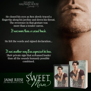 A Sweet Man is an interconnected standalone within The Men of Halfway House series. It is a story about the power of love, the meaning of family, and never giving up on a dream. It includes wounded hearts, an age-gap romance, and enough cake and sweetness to give you a toothache.